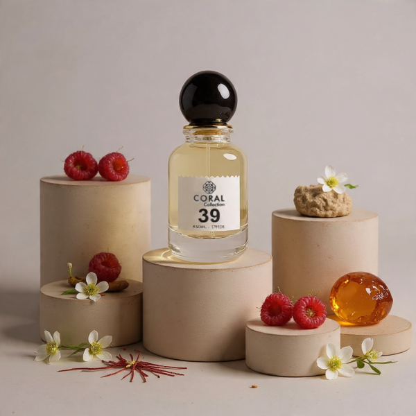 Coral 39 embodies bold sophistication in the heart of the city. Sparkling saffron and juicy raspberry open with a vibrant intensity, while jasmine adds a refined floral elegance. Deep leather and warm amber create a rich, lasting foundation, leaving a trail that is both powerful and unforgettable. This fragrance is for those who embrace the urban night with confidence, poise, and unmistakable style.